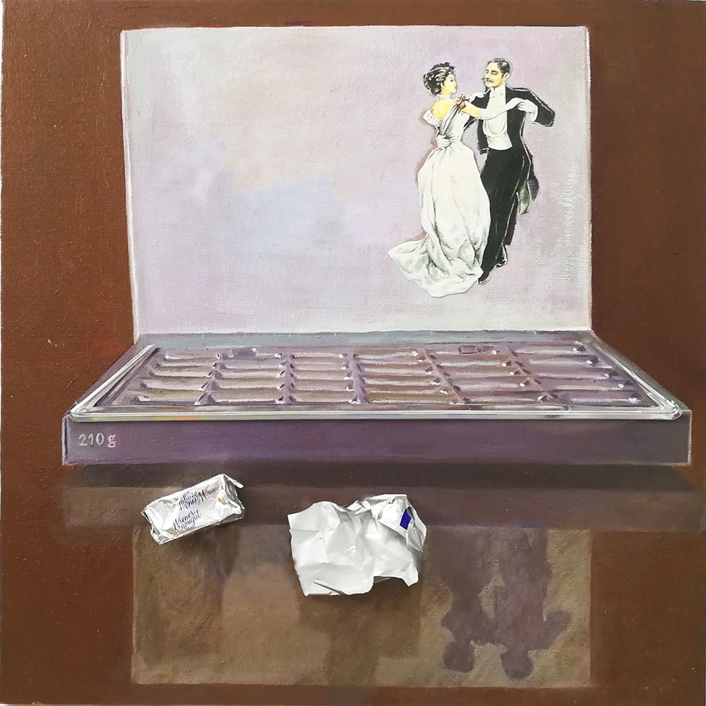 My empty chocolate boxes possess independent identities. Within their emptiness, each one tells a story of solitude, framed within a small space.