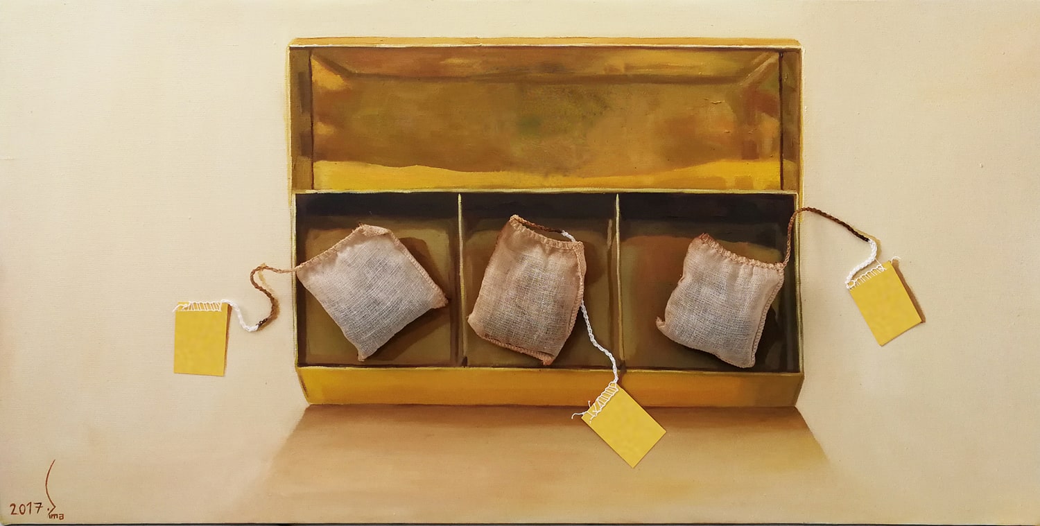 Years passed, and with the arrival of the Tea Box, all of those memories resurfaced. I decided to revive them by painting them on canvas. For this representation, I also used collage techniques to bring the works closer to reality.